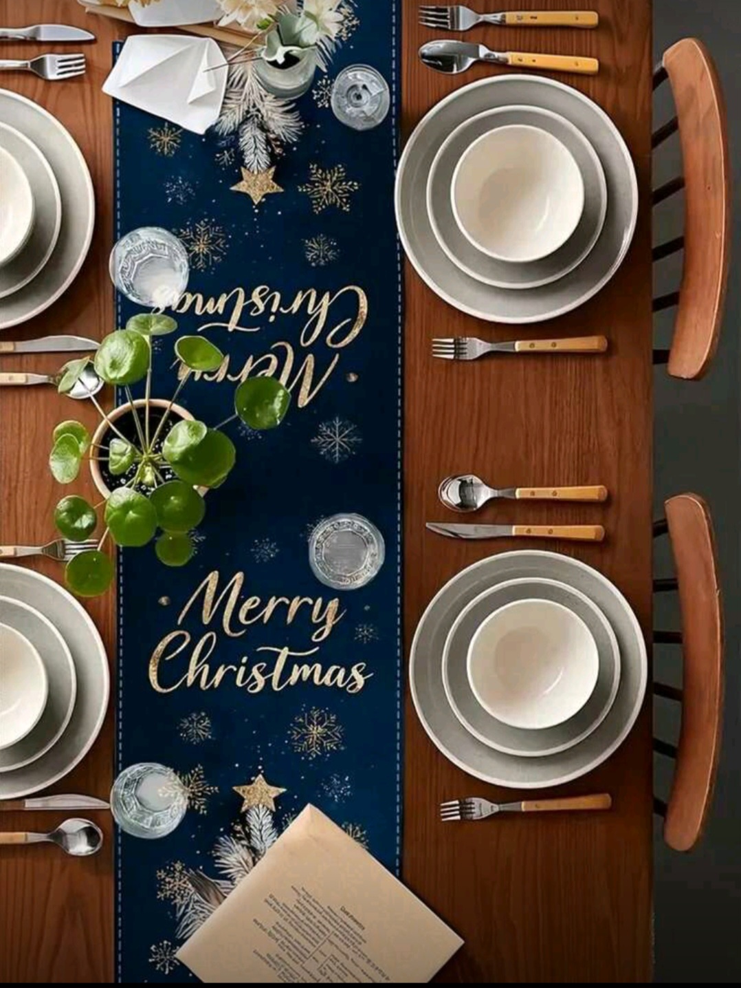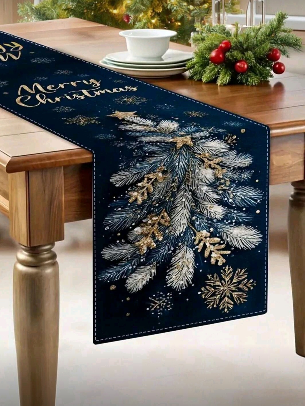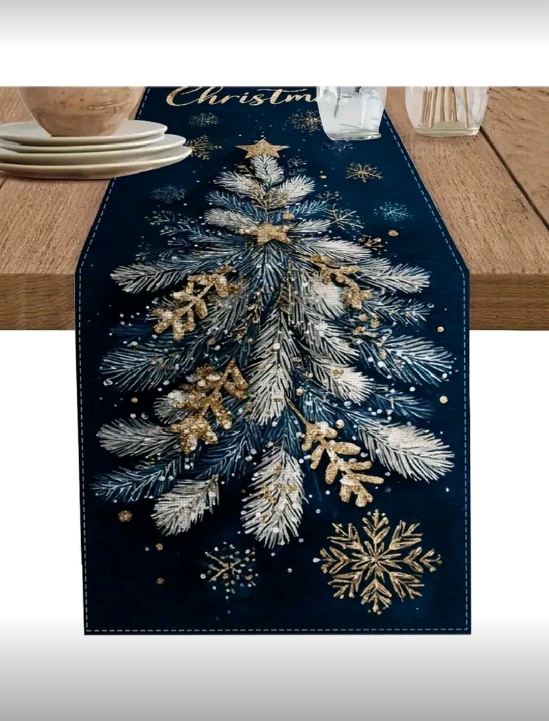 + Free ShippingCamino de mesa con árbol de Navidad dorado pintado a mano de color azul oscuro, decoración navideña para mesa, apto para servicio de catering de vacaciones, lavable a máquina, apto para mesas de todos los tamaños Medida 33×2.00M
